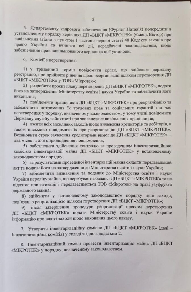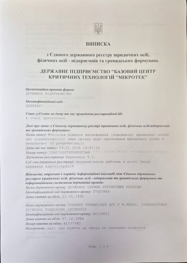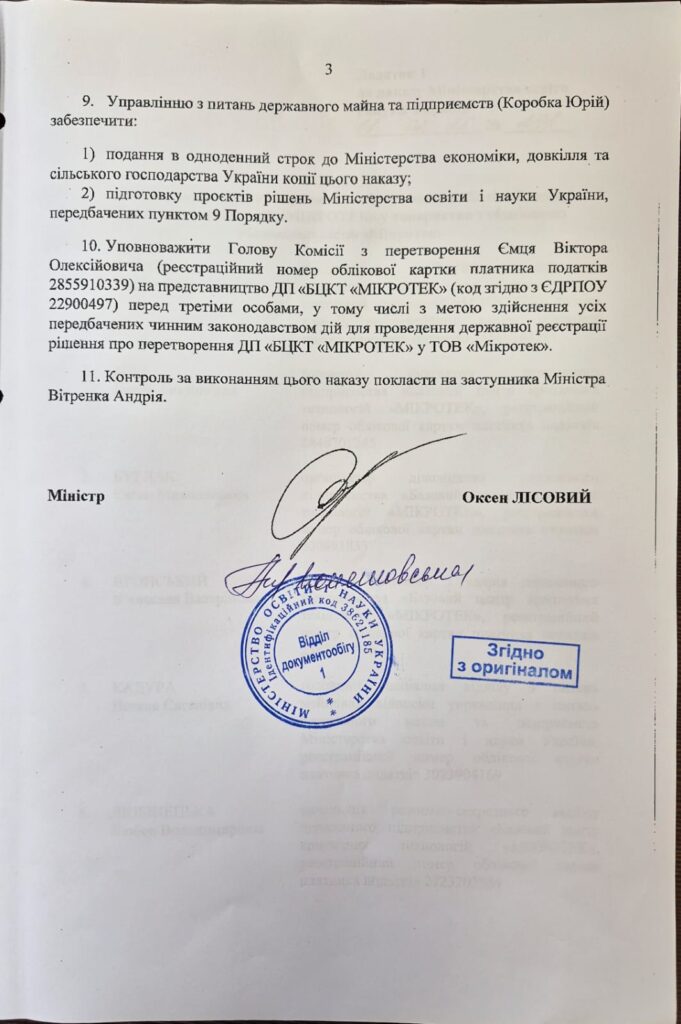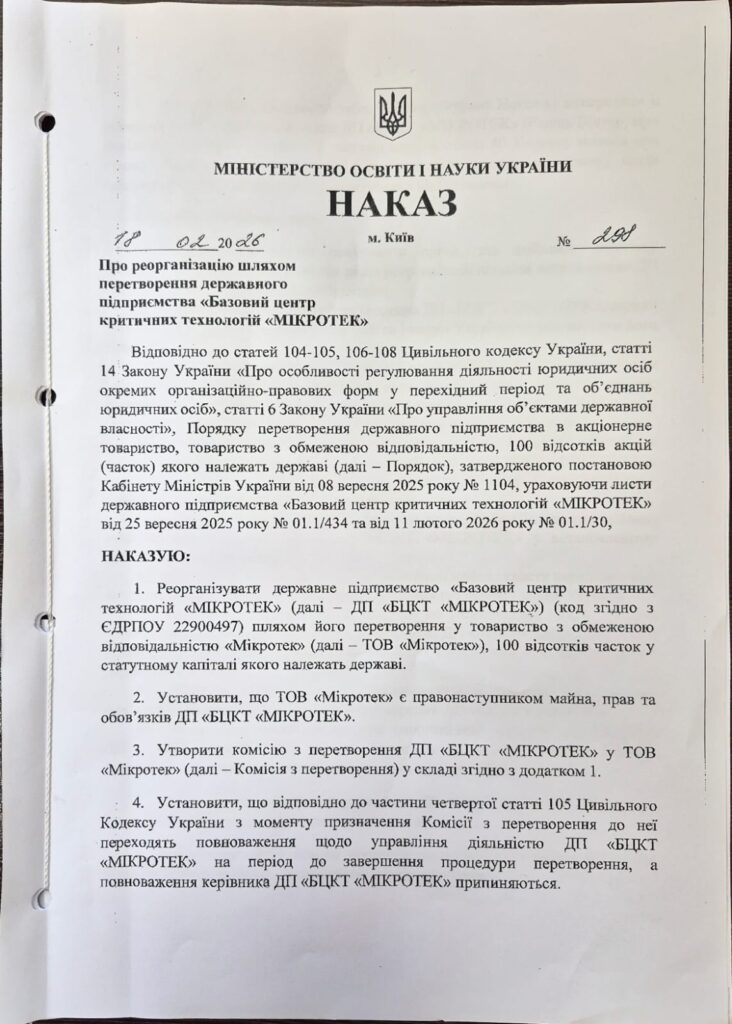 Копія наказу Міністерства освіти і науки України від 18 лютого 2026 року Nº 298 «Про реорганізацію шляхом перетворення державного підприємства «Базовий центр критичних технологій «МІКРОТЕК»